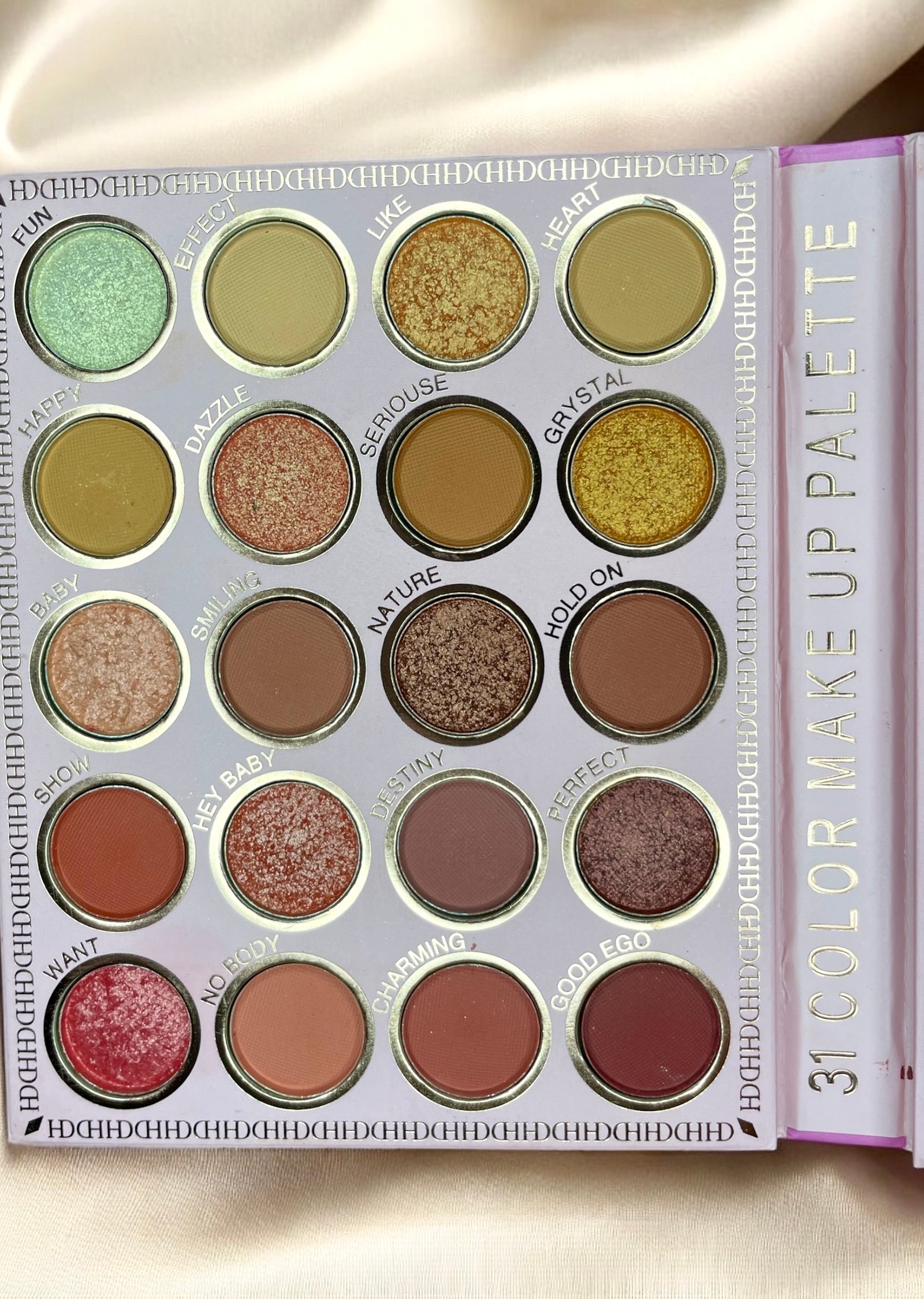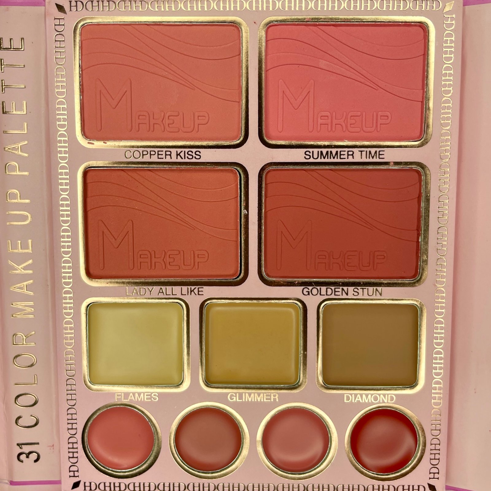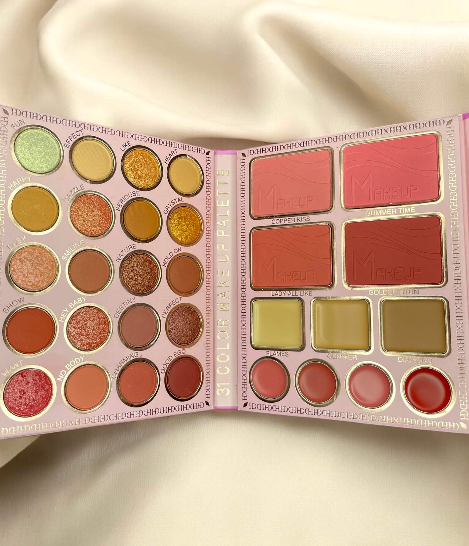 This versatile 31-color makeup palette is a complete beauty essential, featuring a stunning combination of eyeshadows, blushes, contour creams, and lip colors. The left side of the palette contains 18 highly pigmented eyeshadows, offering a mix of matte, shimmer, and metallic shades in warm, golden, and earthy tones—perfect for creating both subtle and glamorous looks. The right side includes four blush shades, ranging from soft pinks to deep reds, three creamy contour shades for sculpting and defining, and six lip colors in a variety of flattering hues. With its compact design and wide color range, this palette is ideal for both everyday wear and bold makeup transformations.