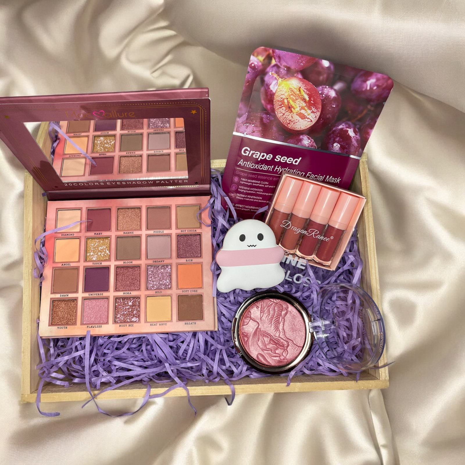 Featuring a versatile 20-shade pink-toned eyeshadow palette, grape seed antioxidant hydrating facial mask, soft blush, mini nude lip gloss collection, and a cute ghost beauty sponge perfect for creating a radiant look! 💖✨.